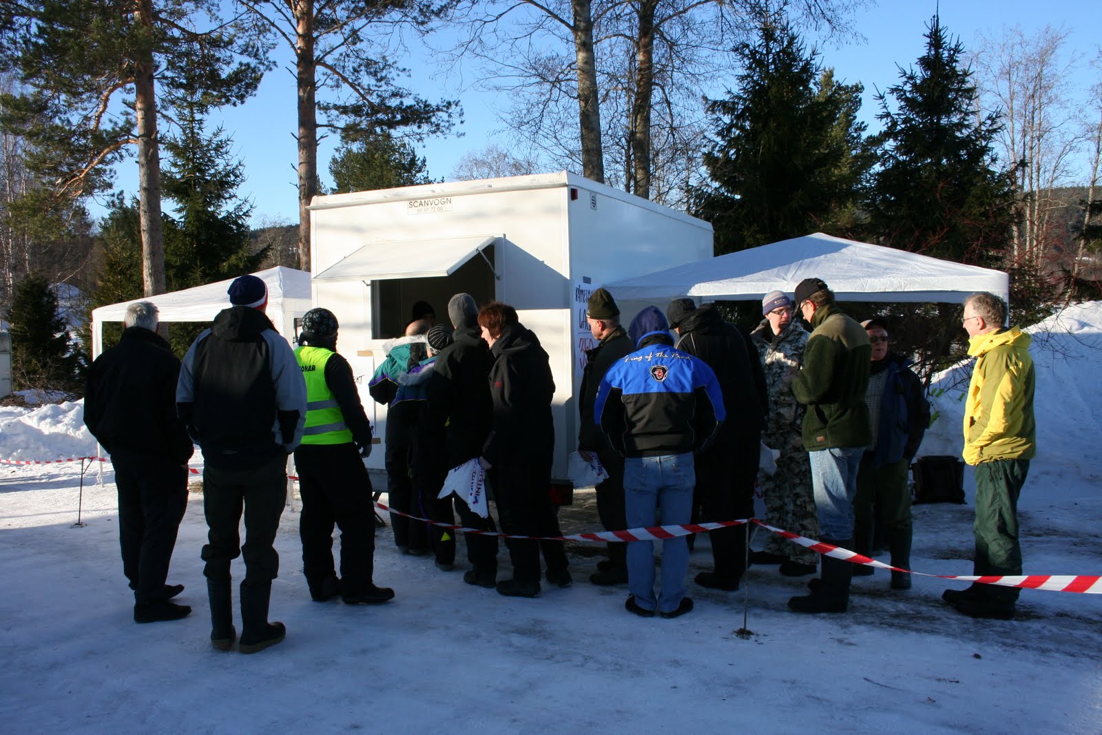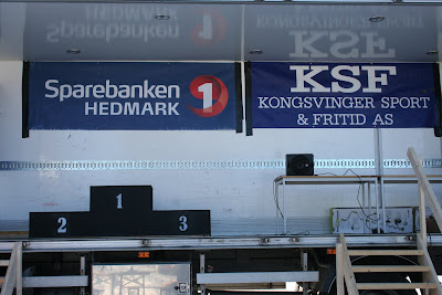 Vi ble sponset med et lån av en flott lastebil fra Engh transport AS. En helt uvurdelig forenkling av gjennomføringen for oss arrangører. Her ser vi pallen med bannere fra vår samarbeidspartner Sparebanken Hedmark og vår sponsor Kongsvinger sport og fritid AS